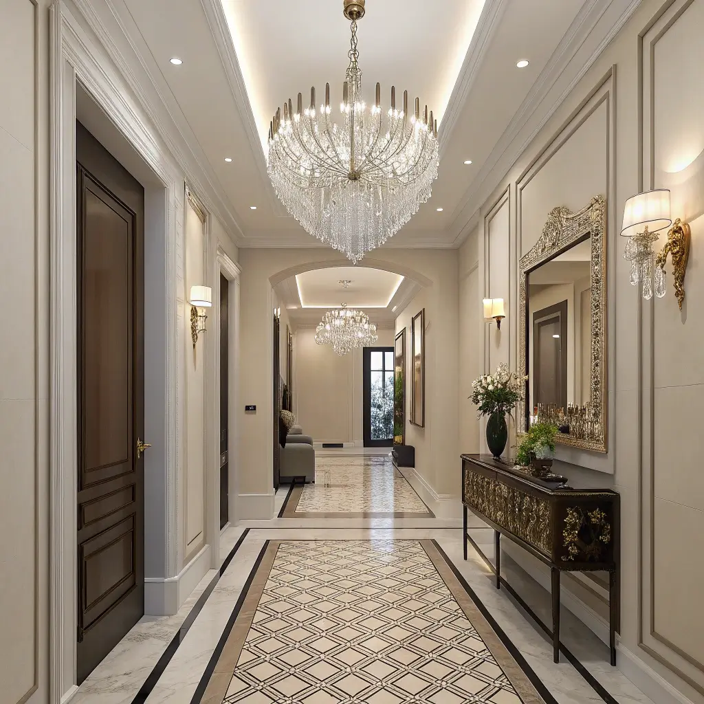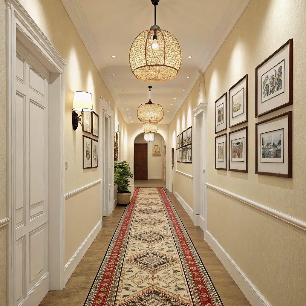 Want your hallway to feel like a warm hug? Layer in rugs and thoughtful lighting. This combination transforms cold, echoey corridors into inviting spaces you actually want to linger in.