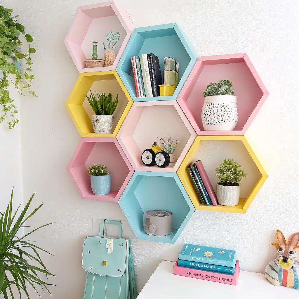 Kids’ rooms are where hexagon shelves can really let loose and have fun. Bright colors, playful arrangements, and practical storage all come together to create spaces that kids actually want to keep organized. (Okay, “want” might be strong, but at least they’ll try.)