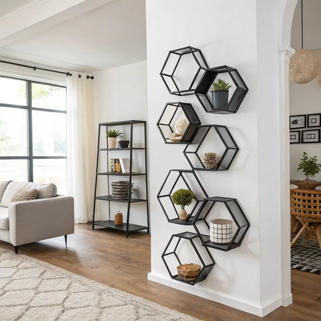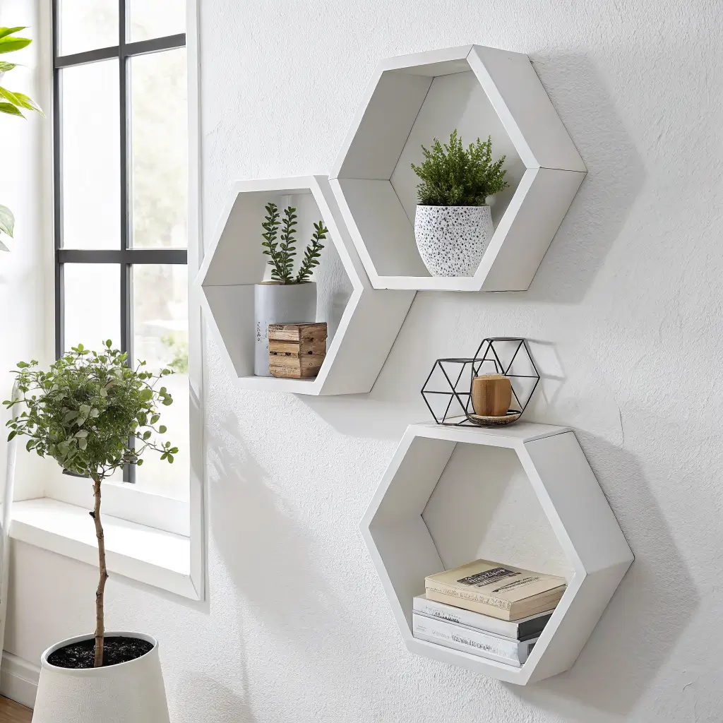 Metal hexagons are having a moment, and honestly, they deserve it. Sleek, industrial, and surprisingly versatile, these shelves bring an edge to any space without trying too hard. They’re like the leather jacket of shelf options – instantly cool.