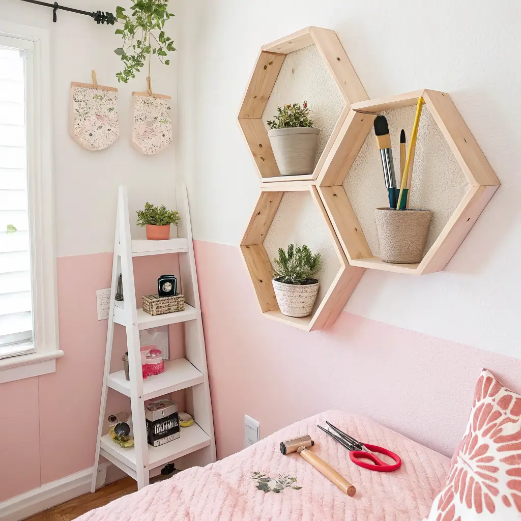 Bedrooms need storage that doesn’t scream “storage,” and hexagon shelves deliver exactly that. They’re functional enough to hold your nighttime essentials but stylish enough to enhance your bedroom’s aesthetic. It’s like having your cake and displaying it too.