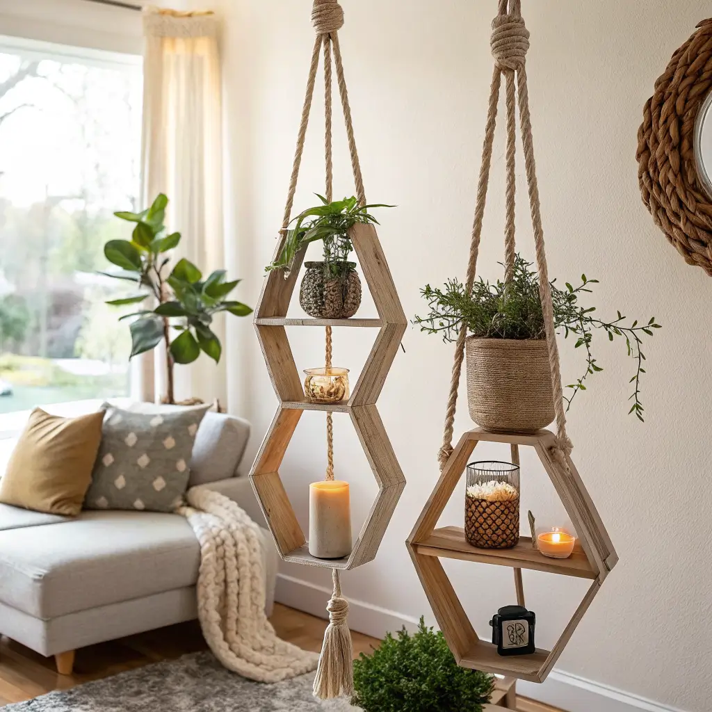 Hanging hexagons add movement and dimension that wall-mounted versions can’t touch. Suspended from the ceiling or hanging from wall hooks, these shelves create layers and depth that make rooms feel larger and more dynamic.