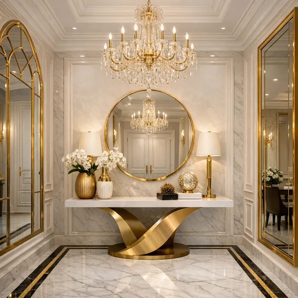 Glamour doesn’t mean impractical. Choose a mirror with a shelf for keys, or sconces that provide actual light, not just ambiance. The best glamorous entrances work as hard as they sparkle :/