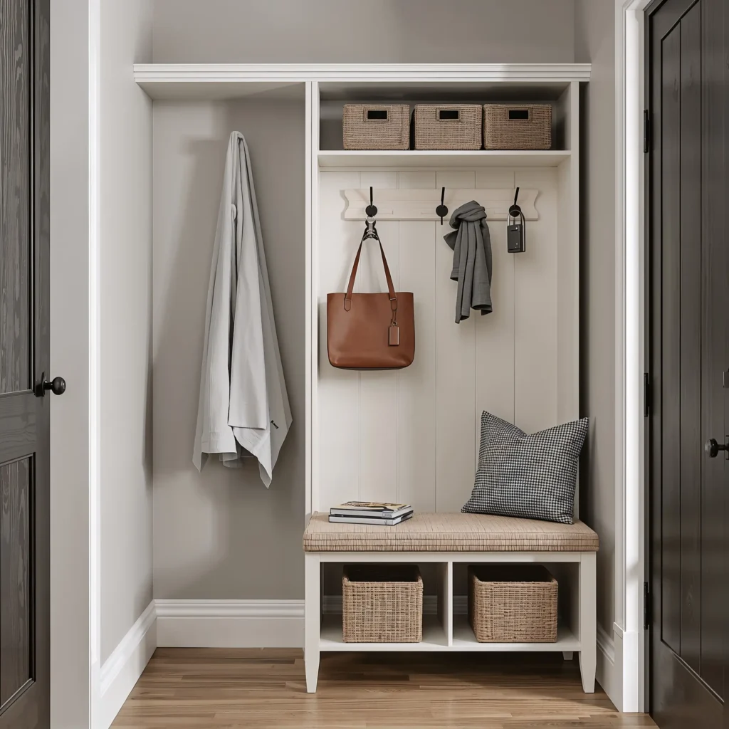• A simple bench or shoe storage that hides the mess