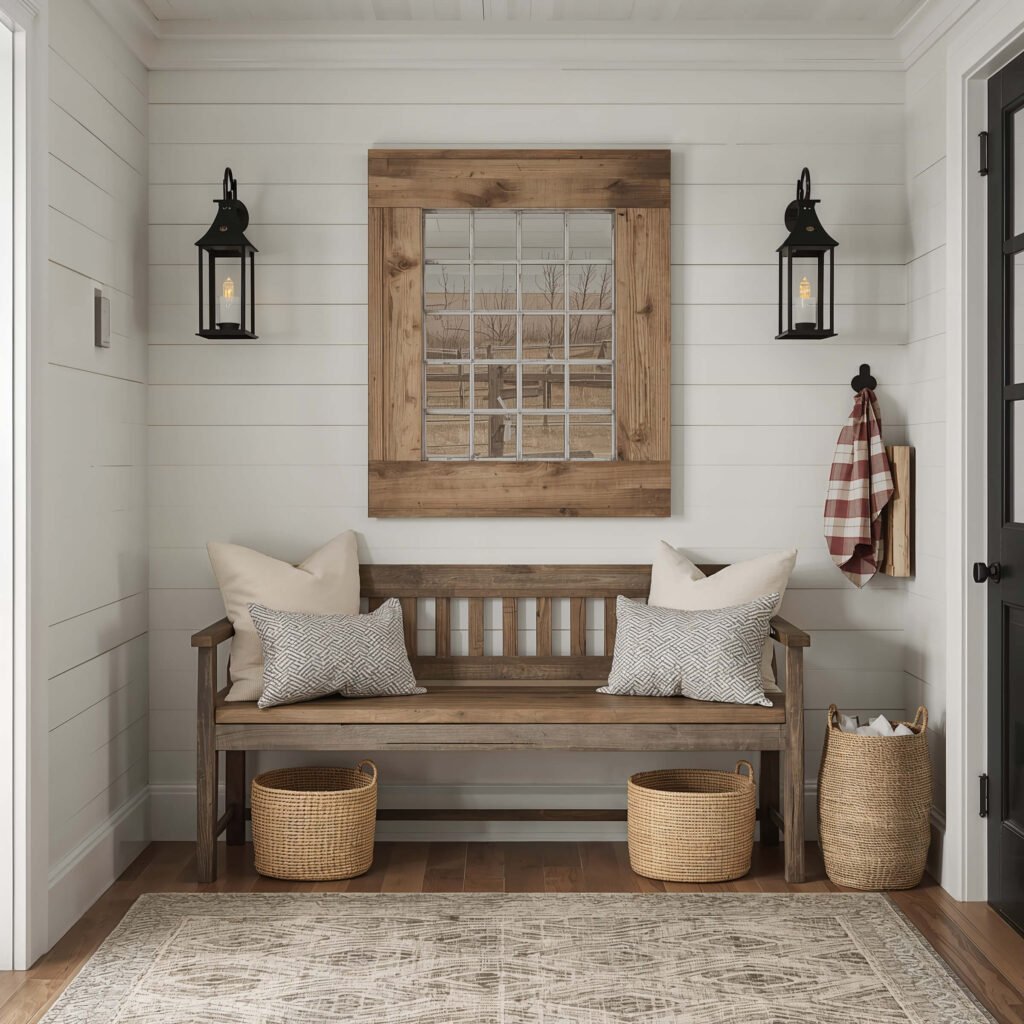 The best farmhouse entrances I’ve seen mix rustic elements with clean, modern touches. Think barn doors with sleek hardware, or antique benches with contemporary cushions.