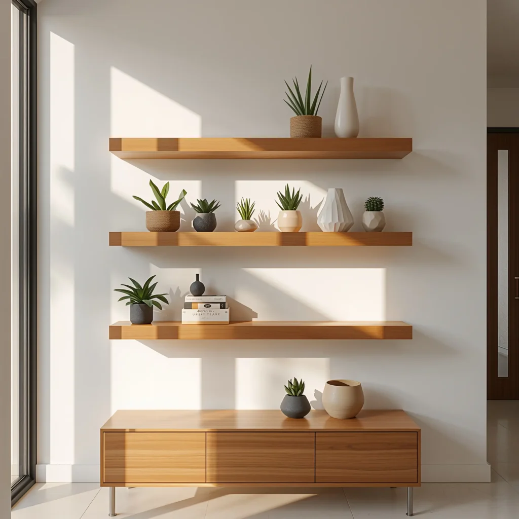 Let me tell you about my absolute favorite entrance wall hack – floating shelves paired with plants. This combo literally changed the entire vibe of my hallway, and it took maybe two hours to set up (okay, three if you count the trip to Home Depot).
