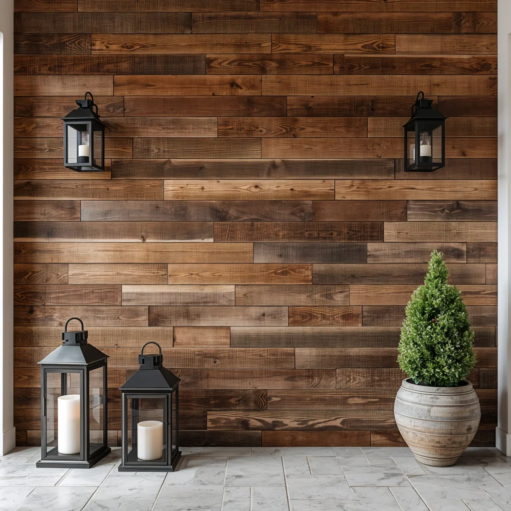 Nothing says “welcome home” quite like the warmth of wood. A rustic wooden accent wall brings that cozy cabin vibe right into your entrance, even if you live in a studio apartment downtown.