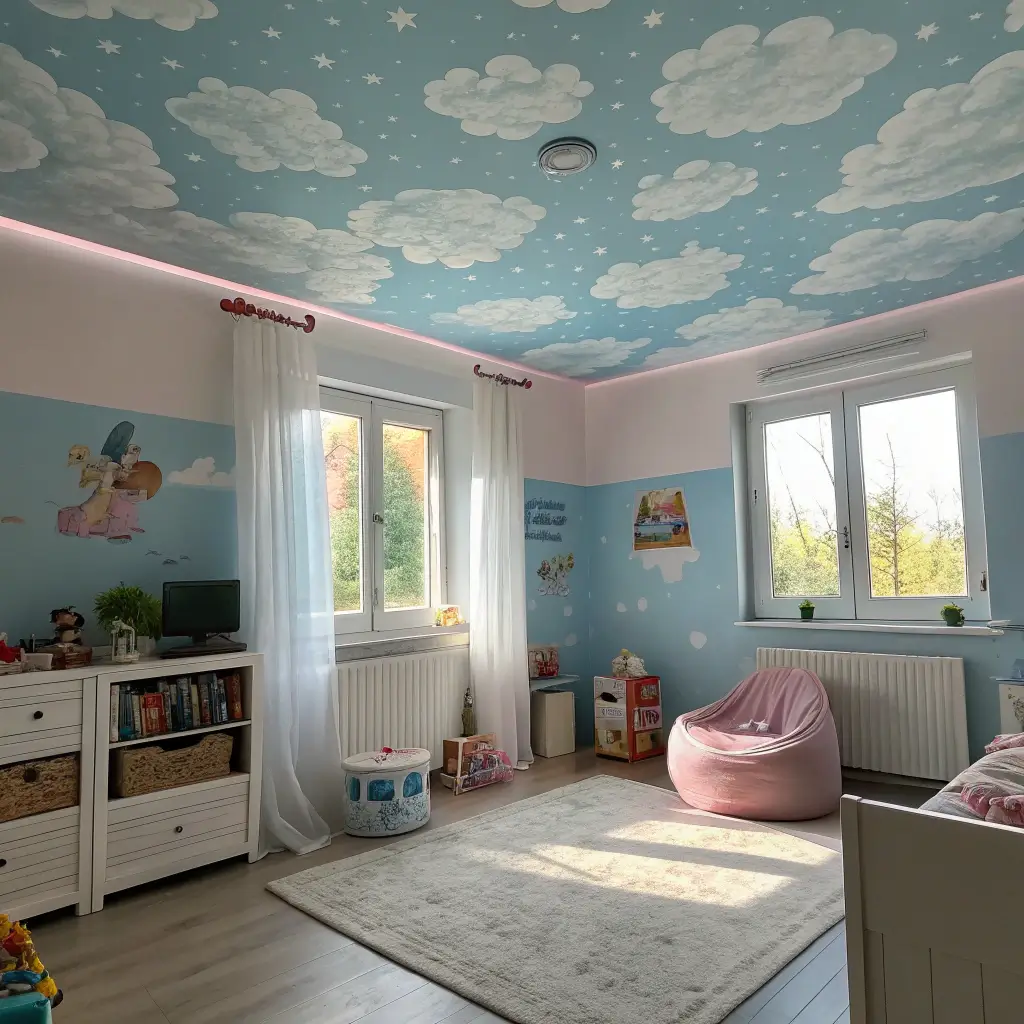 Remember lying on grass, staring at clouds? Sky-themed ceilings bring that feeling indoors. My kids’ playroom has a cloud ceiling I painted myself, and they spend hours just looking up and imagining. It’s basically free entertainment.
