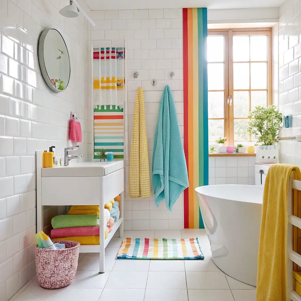 The key here is balancing vibrant colors without creating visual chaos. I learned this the hard way when my first attempt looked like a paint factory exploded. Now I stick to rainbow accents against neutral backgrounds—think white walls with rainbow shower curtains, towel sets, and wall decals.