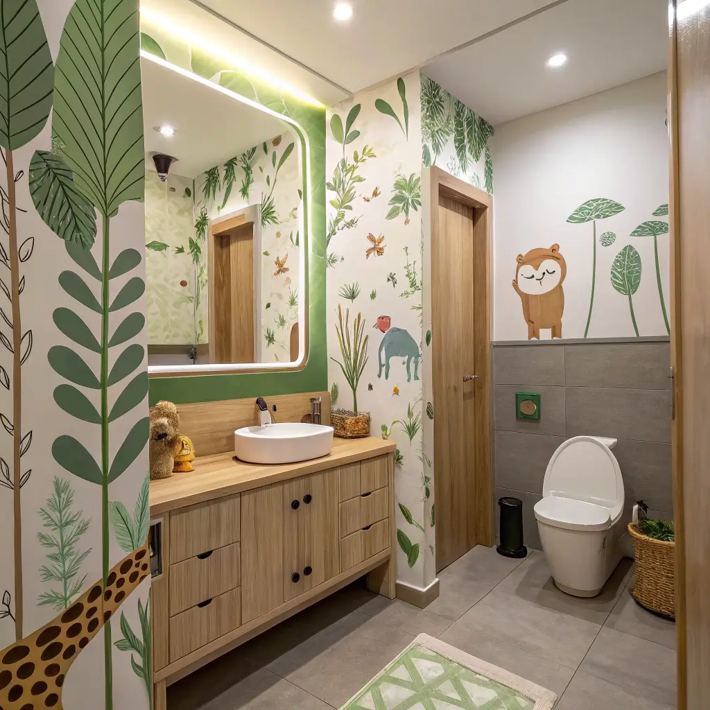 Transform your bathroom into a wild adventure where every shower becomes an expedition. This theme works brilliantly because it grows with your kids—toddlers love the cute animals while older kids appreciate the adventure aspect.