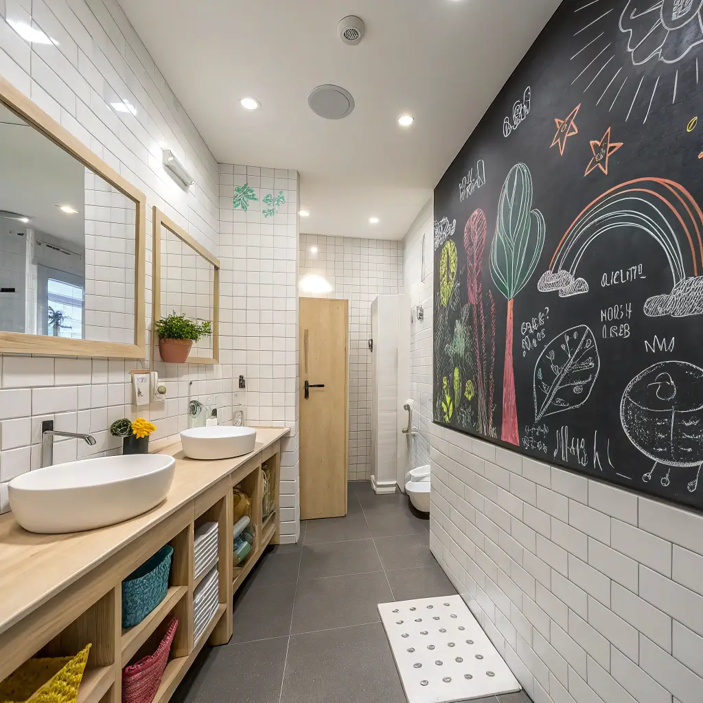 Give kids creative freedom while containing the mess—chalkboard walls in bathrooms are genius-level parenting.