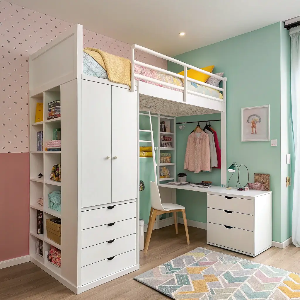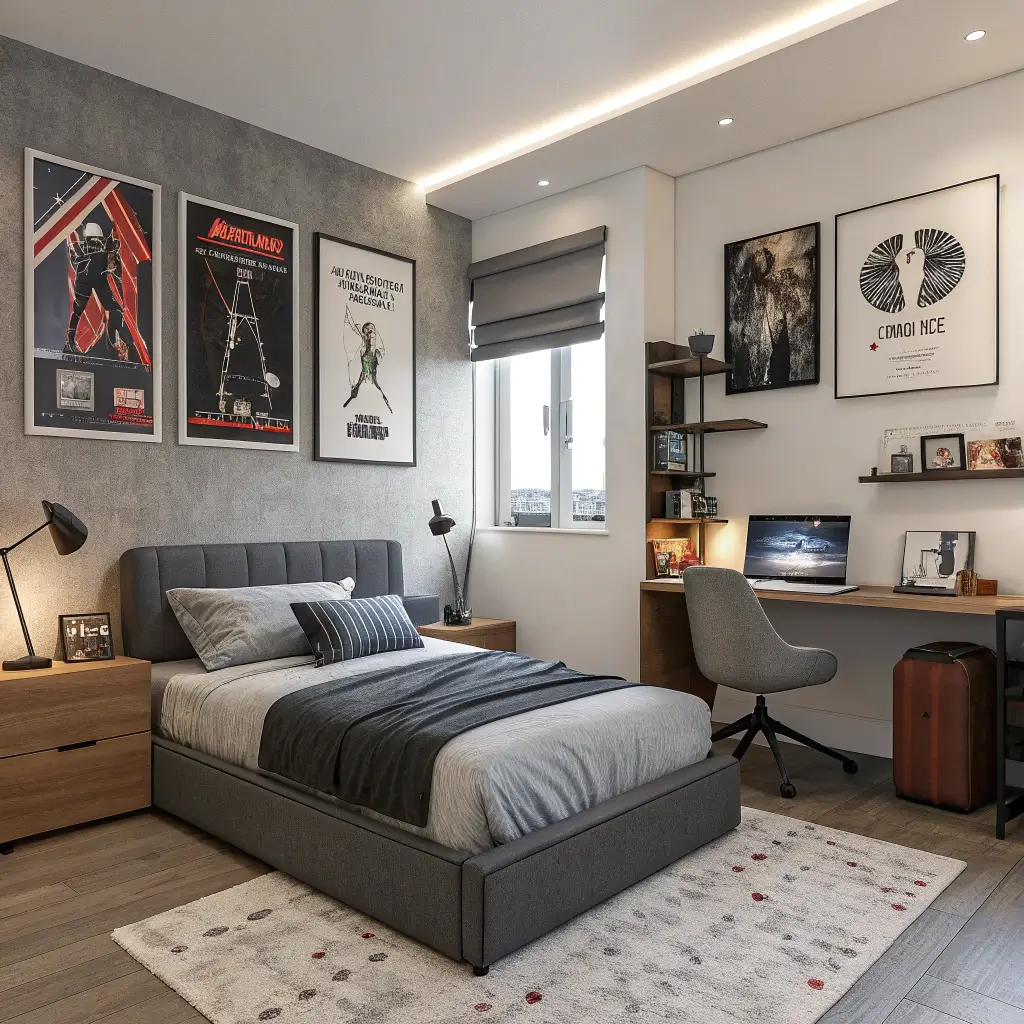 Loft beds are your new best friend – they literally double your floor space. Underneath, you can create a study area, gaming setup, or just a chill zone with bean bags. Wall-mounted everything becomes your mantra: desks, shelves, lights, even chairs that fold flat against the wall when not in use.