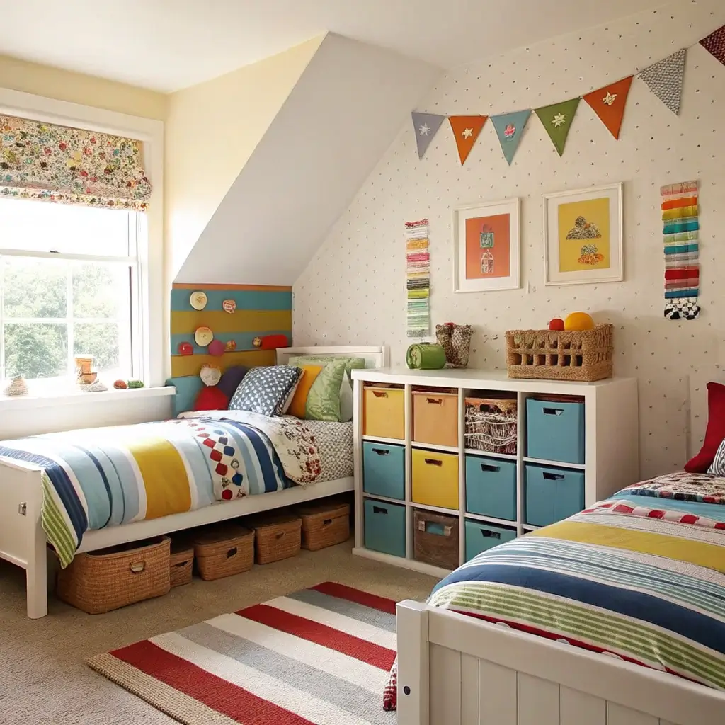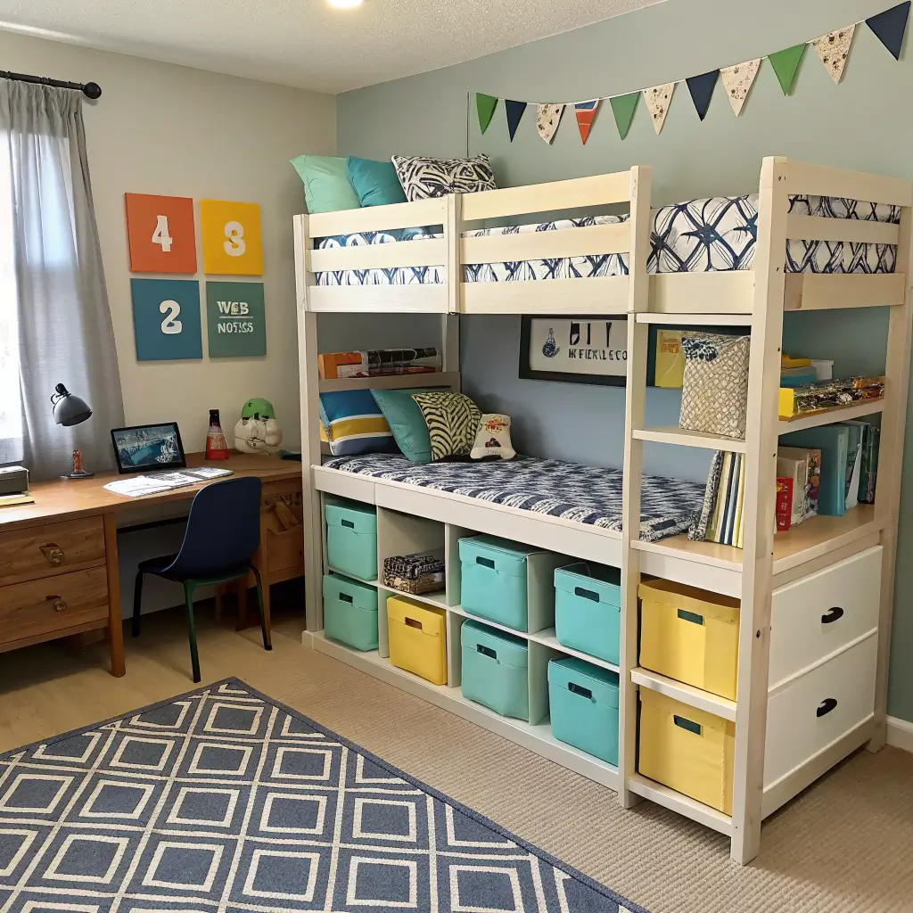 Install double everything when possible: two desks, two hampers, two sets of shelves. Curtains or room dividers provide privacy when needed. Shared spaces like play areas need clear rules posted on the wall.