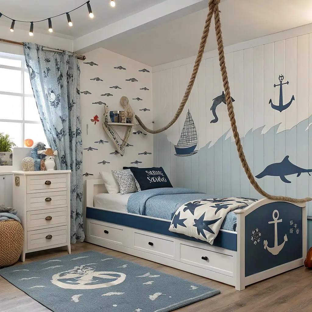 Create a boat-shaped bookshelf or bed frame if you’re handy with woodworking. Hang fishing nets in corners for lightweight toy storage. Maps of ocean currents or famous naval battles combine decoration with education.