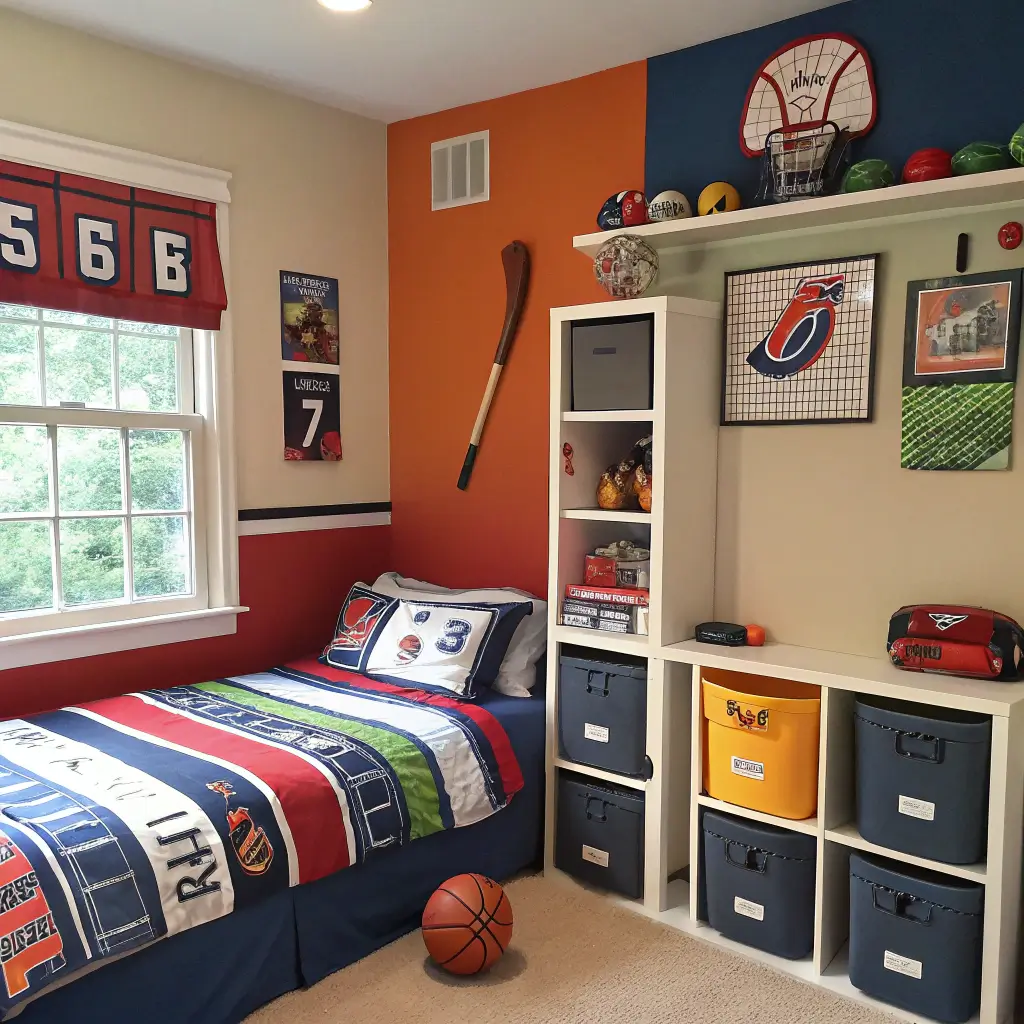 Incorporate team colors throughout accessories and bedding. A scoreboard-style clock keeps time while maintaining theme. Locker-style storage brings authentic athletic vibes while keeping gear organized.