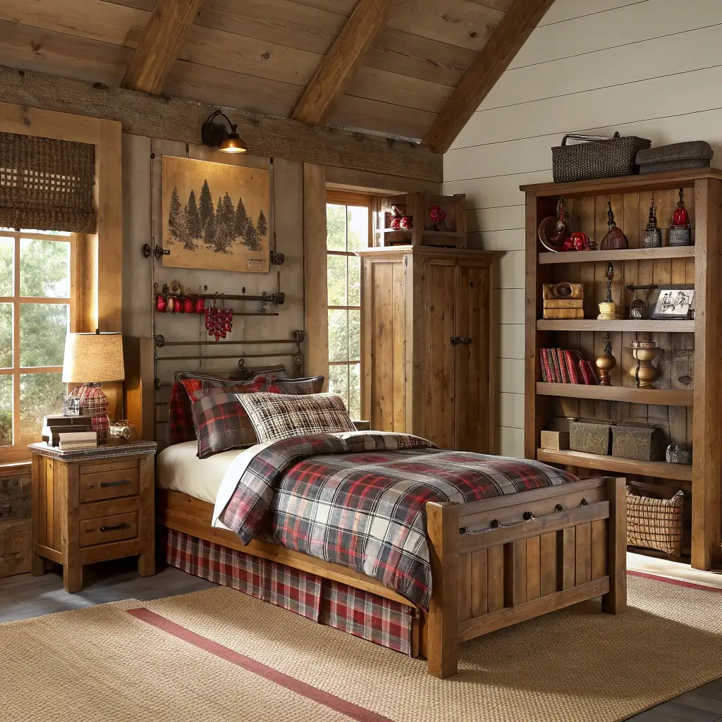 Reclaimed wood accent walls instantly add cabin character. Log-style bed frames or furniture bring outdoor vibes inside. Plaid patterns in bedding and curtains complete the lumberjack aesthetic.