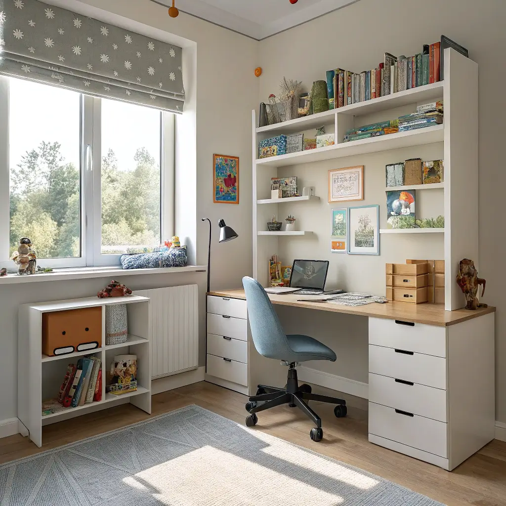 Position desks near natural light but away from bed sightlines – separation helps focus. Ergonomic chairs prevent back problems and improve concentration. Install shelving at kid-height for easy access to supplies.