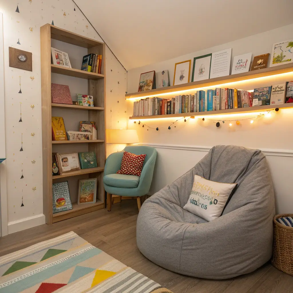 Corner spaces work perfectly for reading nooks – add a tent, canopy, or fort structure. Bean bags, floor cushions, or a small armchair create comfortable seating. Install wall-mounted book displays showing covers face-out to encourage browsing.
