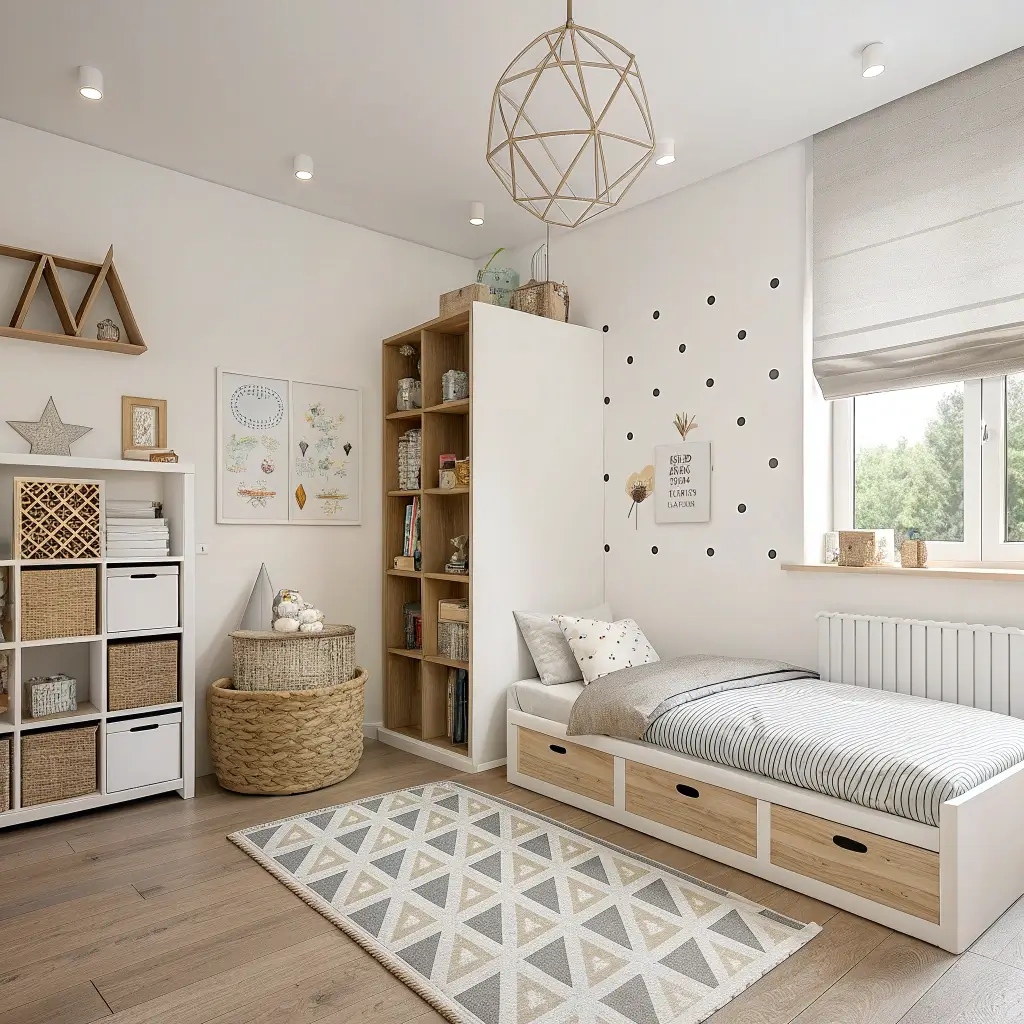 Stick to a neutral base – whites, grays, soft woods – then let toys and books add the color. Those Scandinavian-style house beds? They’re simple, modern, and kids love the cozy factor. Add some geometric wall decals in one or two accent colors for visual interest without overwhelming the space.