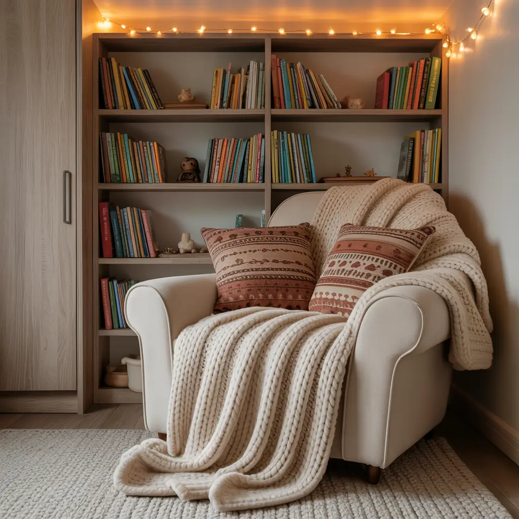 - Comfortable seating (bean bags, floor cushions, small armchair)