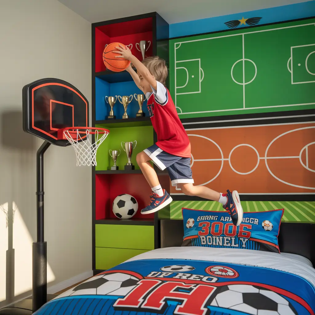 My son’s basketball-themed room features a full-wall mural of his favorite team’s arena. We added a mini hoop, jersey displays, and vintage sports posters. His friends think it’s the coolest room ever, and honestly, they’re not wrong!