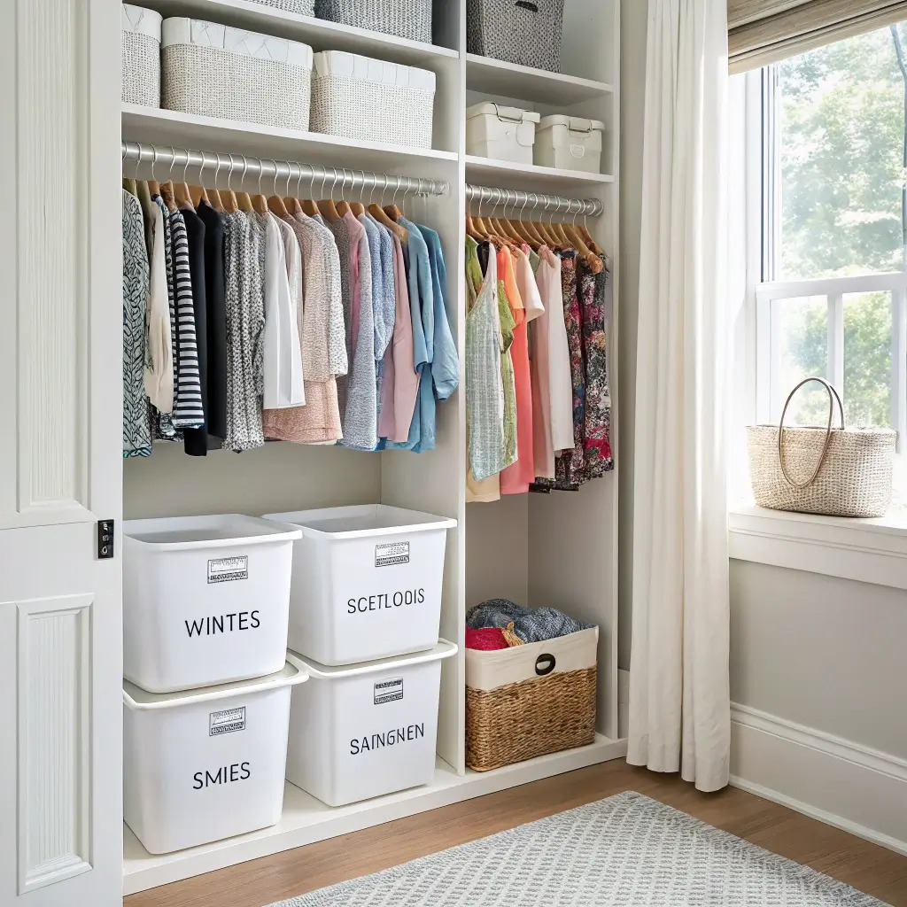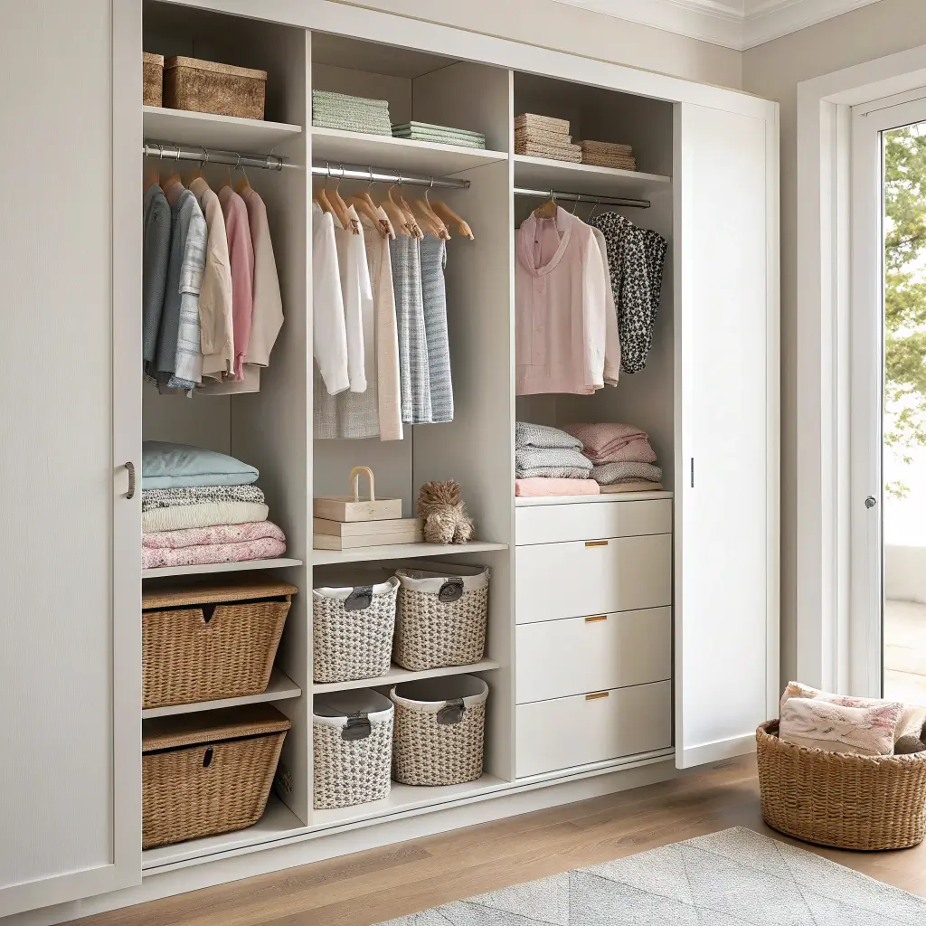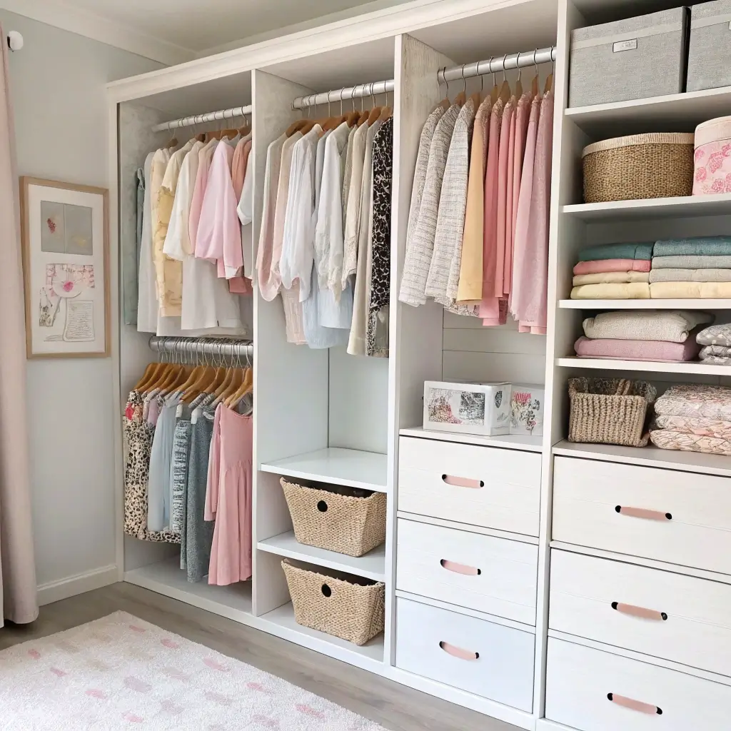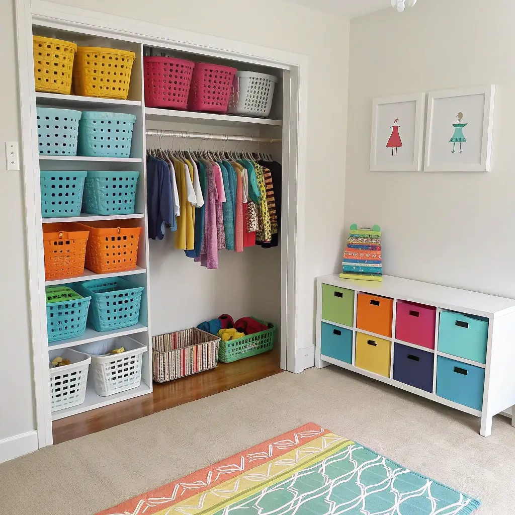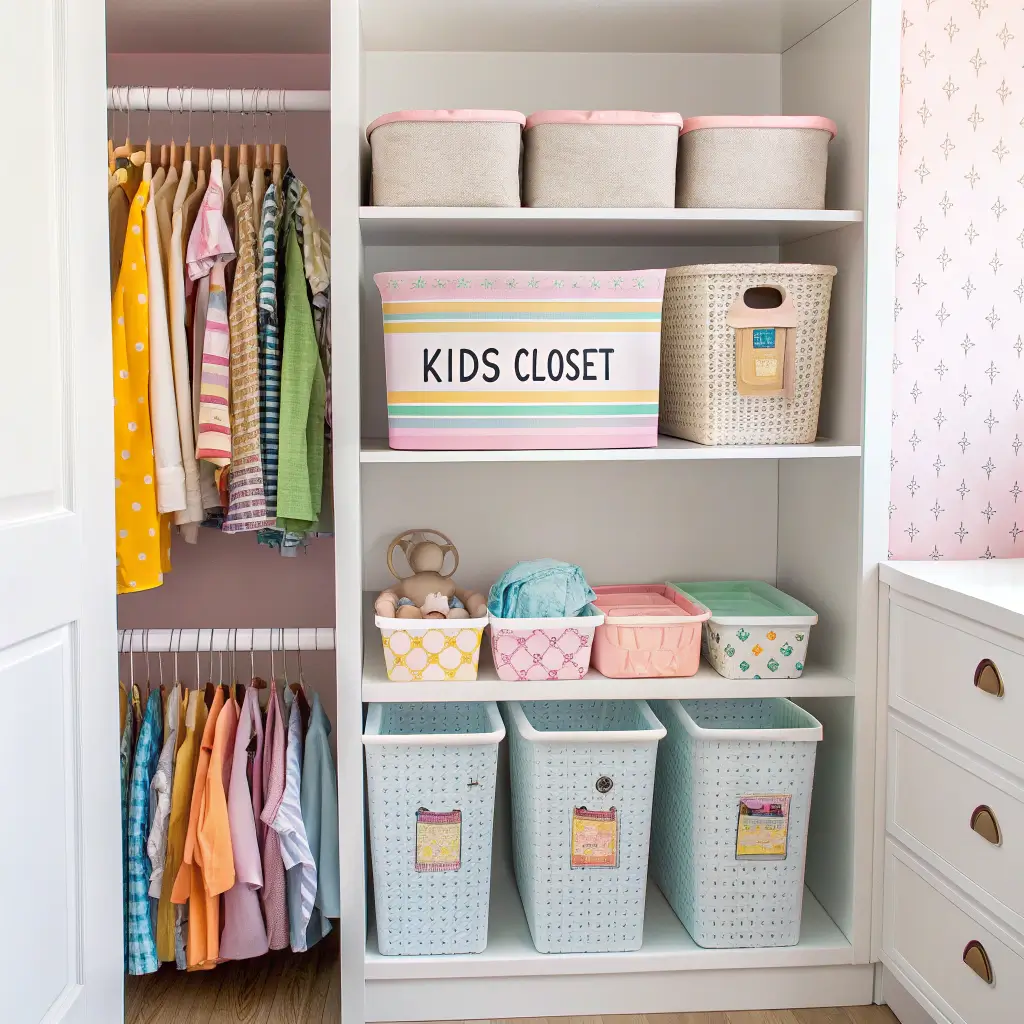 I use vacuum storage bags for out-of-season clothes and store them on the top shelf. Every few months, we have a “closet swap day” where we pack away old season clothes and bring out the new ones. My kids actually look forward to it – it’s like getting a whole new wardrobe!