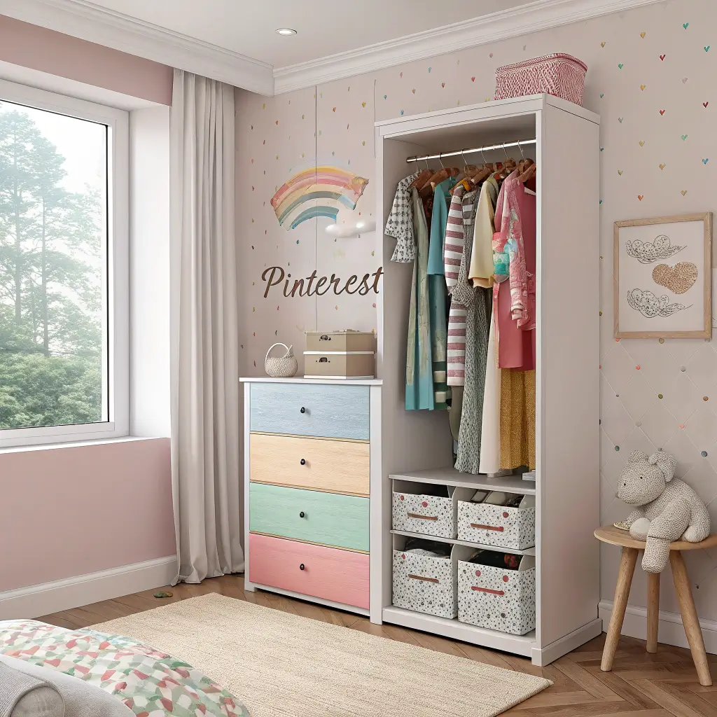 Picture this: upper section for hanging clothes, middle drawers for folded items, and lower section with bins for toys. Everything in one place! My kids actually put toys away now because they’re right there with their clothes during cleanup time.