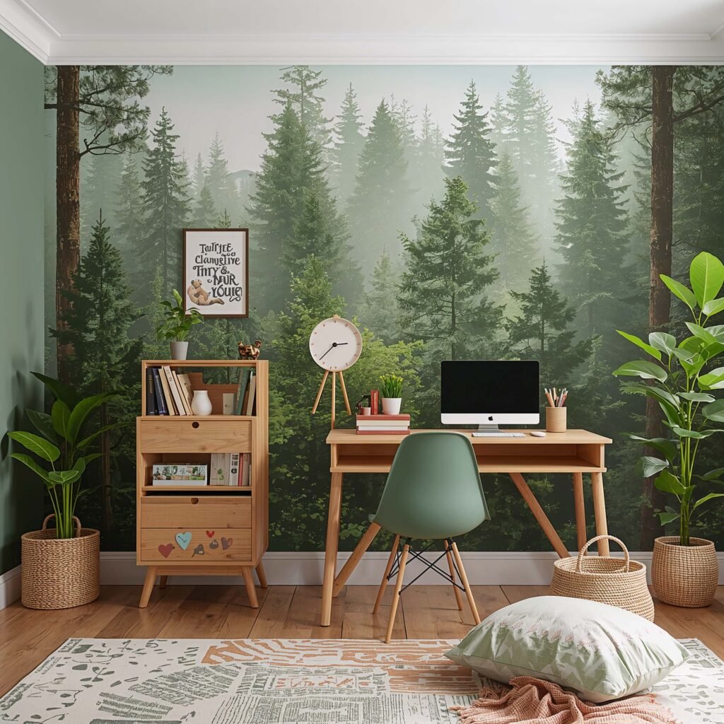 Forest themes work because they’re calming yet stimulating. Green tones improve concentration (science backs this up, FYI), and nature elements reduce stress. It’s basically therapy disguised as decor.