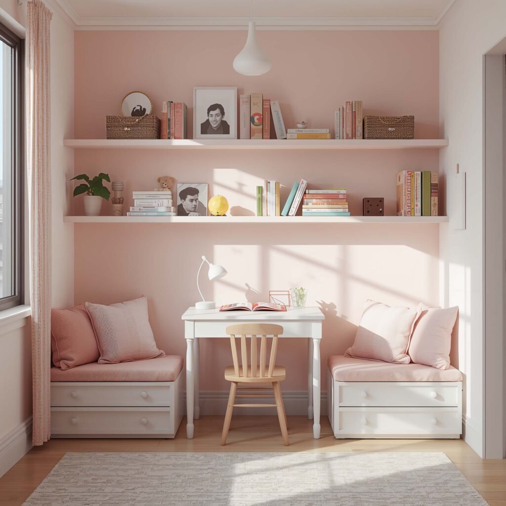 Floating shelves above a desk = maximum storage with minimum footprint. This setup makes small rooms feel bigger and gives kids easy access to everything they need. No more “I can’t find my calculator” excuses!