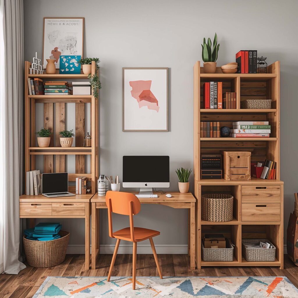 - Natural wood accents on desk legs or shelving
