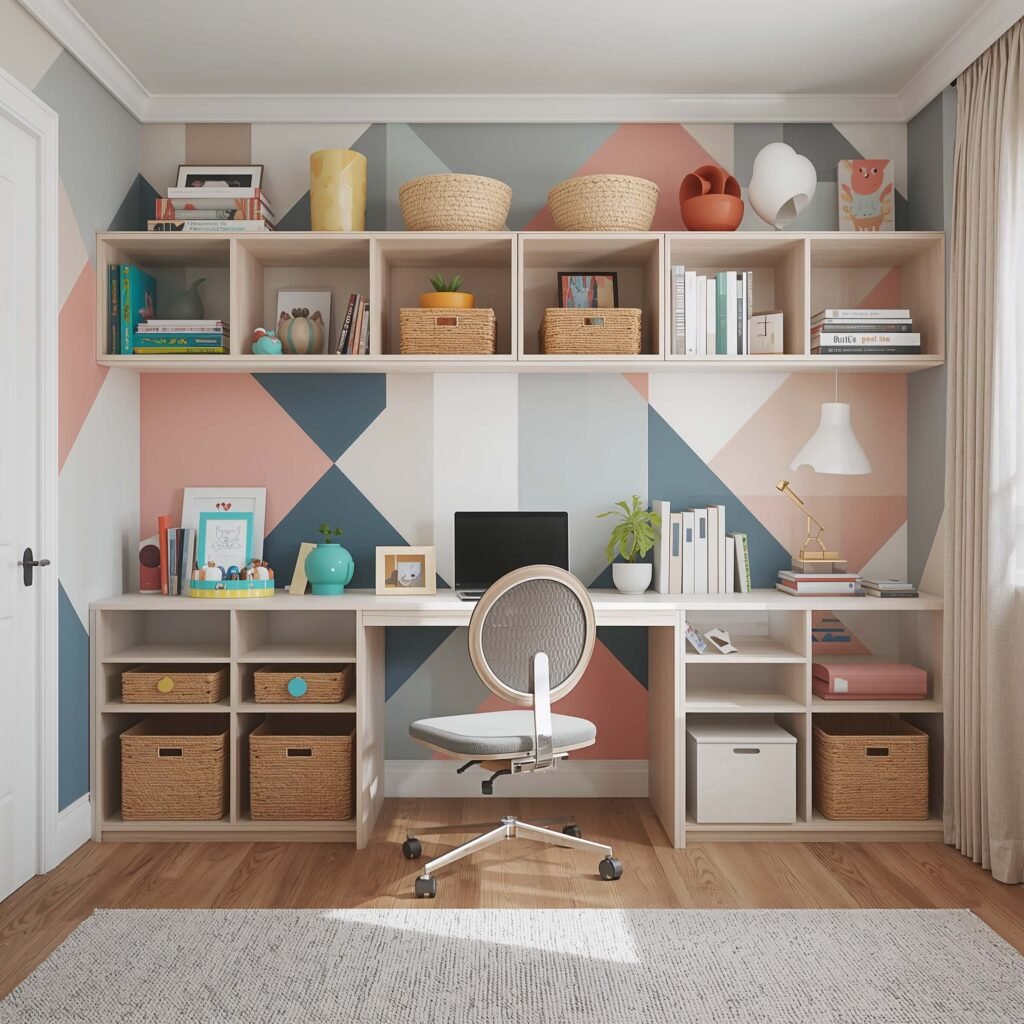Who says study rooms have to be boring? Bold geometric patterns inject energy without overwhelming the space. My son’s room features a triangle pattern in three shades of blue, and visitors always comment on how cool it looks.