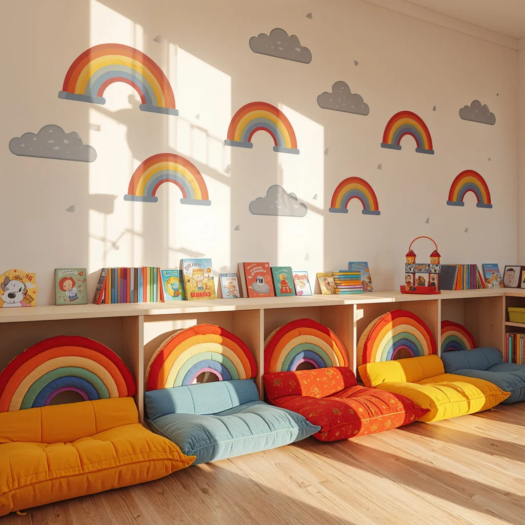 Inside this rainbow paradise, you’ll want to make things comfy. Throw in some oversized floor pillows, a small bookshelf at kid height, and maybe even some battery-operated string lights. I found these amazing cloud-shaped pillows at a discount store that my kids absolutely adored. The key here is making the space feel special and separate from the rest of the classroom.