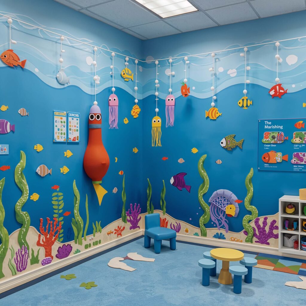 IMO, the best part of this theme is how versatile it is for learning activities. Use it for teaching habitats, counting with sea creatures, or even as a calm-down space when kids need to “swim away” from overwhelming situations. I keep a basket of ocean-themed books and sea creature puppets in this area.