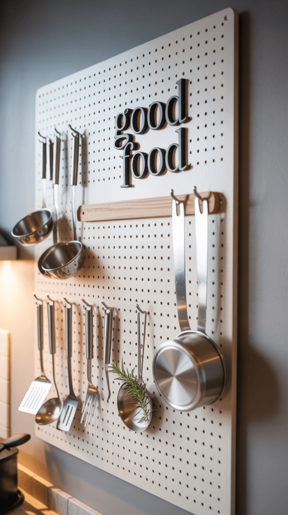 - What to Hang: Ladles, whisks, spatulas, measuring cups, strainers, pot holders—if it has a hole or a handle, it can probably live on the pegboard.