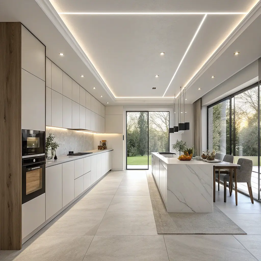 Think of slim border ceilings as the sophisticated frame around your kitchen masterpiece. They add definition without overwhelming the space—perfect for those who want interest without drama.