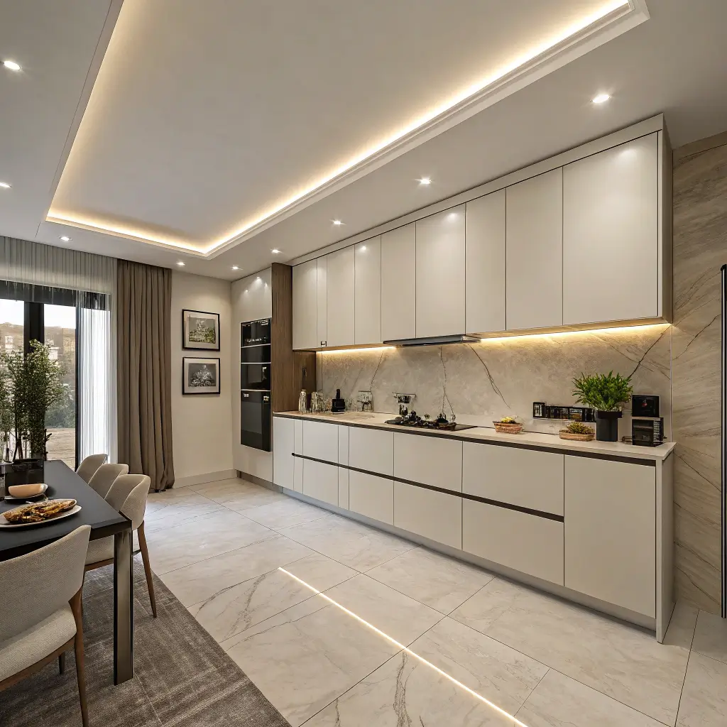 Let’s start with something clean and sophisticated. Gypsum ceilings are basically the little black dress of kitchen design—timeless, versatile, and they go with everything.