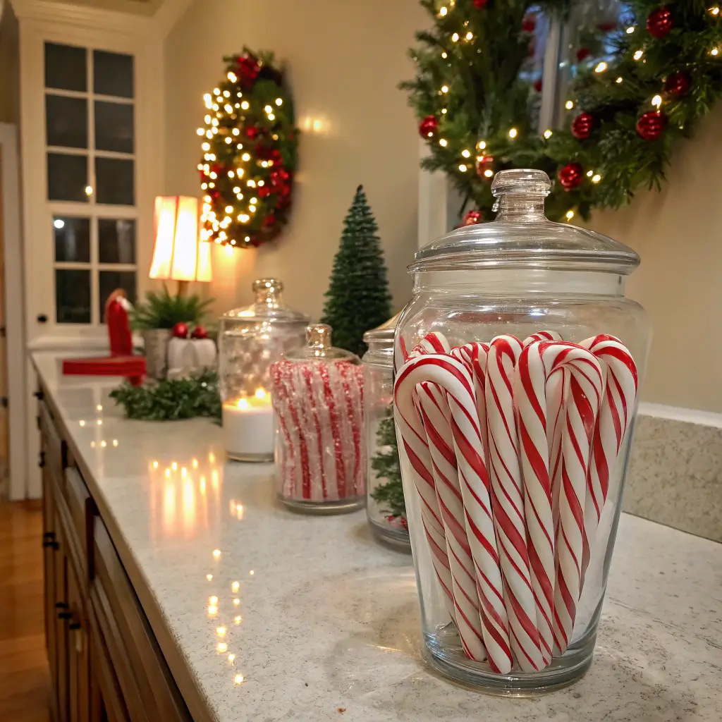 Nothing says Christmas quite like candy canes, and turning them into a decorative element kills two birds with one stone. Clear glass jars filled with candy canes create instant holiday decor while keeping treats accessible for sneaky midnight snacking (we’ve all been there).