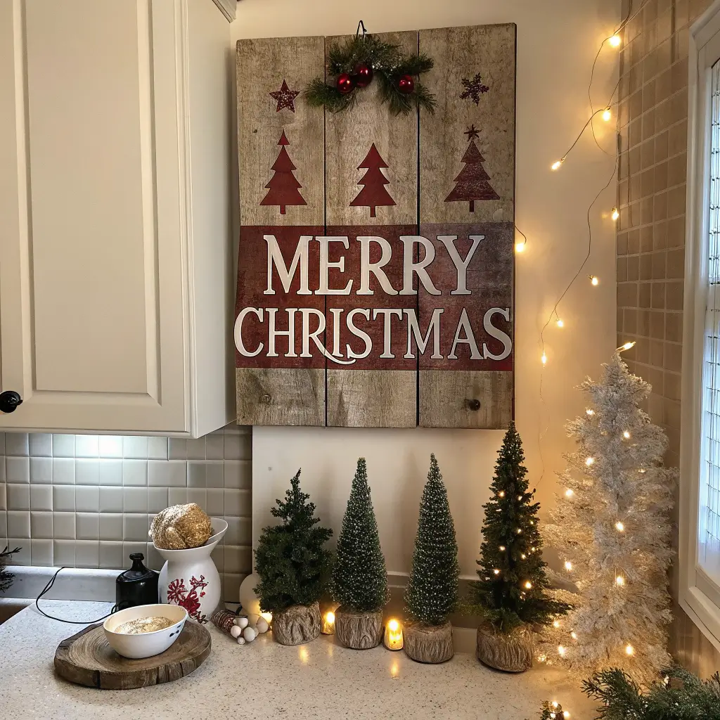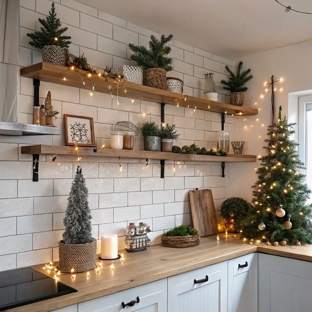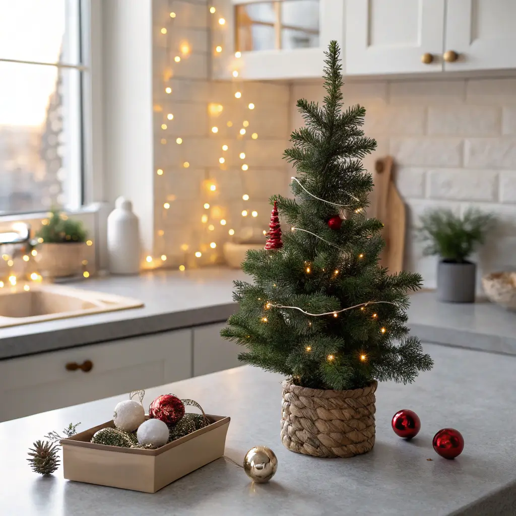 Let’s kick things off with my personal favorite – mini Christmas trees on your countertops. I started doing this three years ago when I realized my kitchen looked boring compared to my living room. These tiny trees pack a massive festive punch without hogging precious prep space.