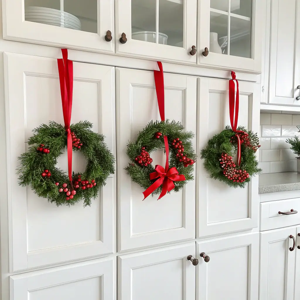 Why should your front door have all the wreath fun? Mini wreaths on cabinet doors create rhythm and repetition that designers love talking about.