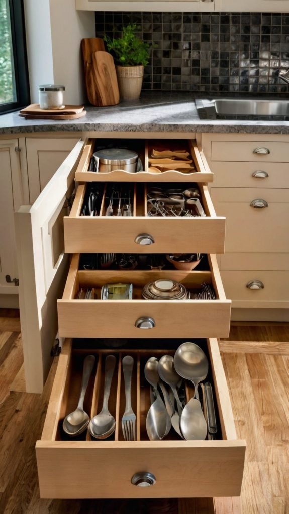 How it Works: The drawers are fitted with custom dividers, creating specific compartments for your kitchen tools. Think of it like a giant, built-in utensil tray, but for pots, lids, cutting boards, or baking sheets.