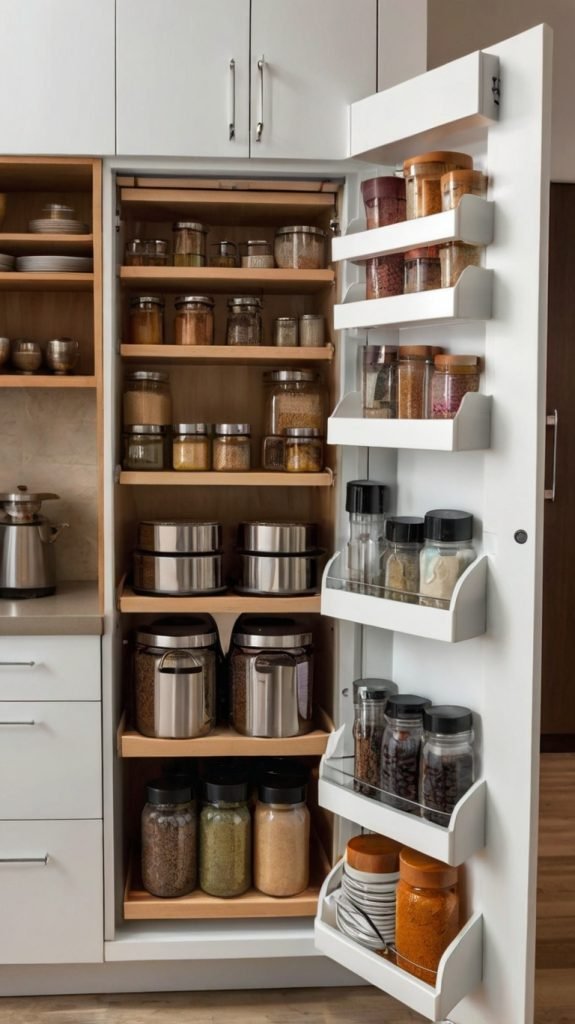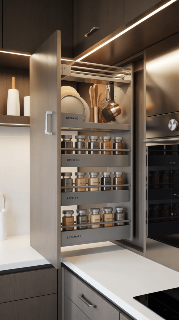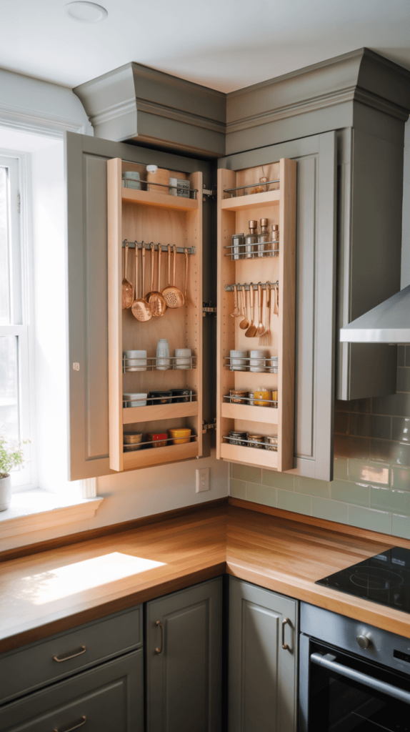 How it Works: This can take many forms. It could be a tiered pull-out shelf unit designed for spice jars, a door-mounted rack on the inside of the corner cabinet door, or even a narrow, vertical pull-out unit (like Idea #4) specifically for spices.
