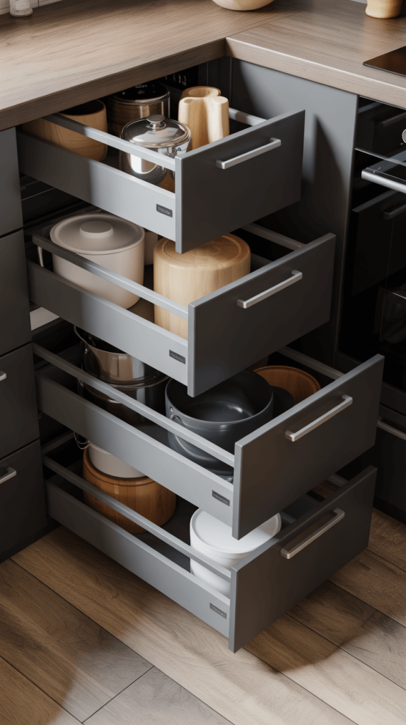 Who says cabinets only have shelves? This idea flips the script entirely. Instead of a deep shelf, you install deep drawers that are specifically designed to navigate the corner angle.