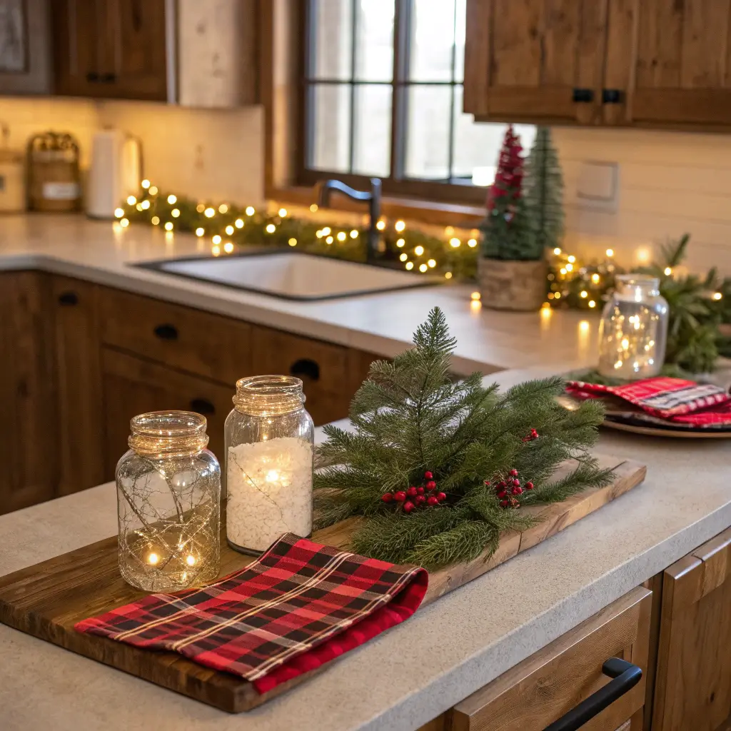 Start by laying down a burlap table runner along one section of your counter. Add wooden cutting boards propped against the backsplash as a backdrop. Then layer in your Christmas elements with pine garland, red buffalo plaid accents, and maybe a vintage-style Santa or two.