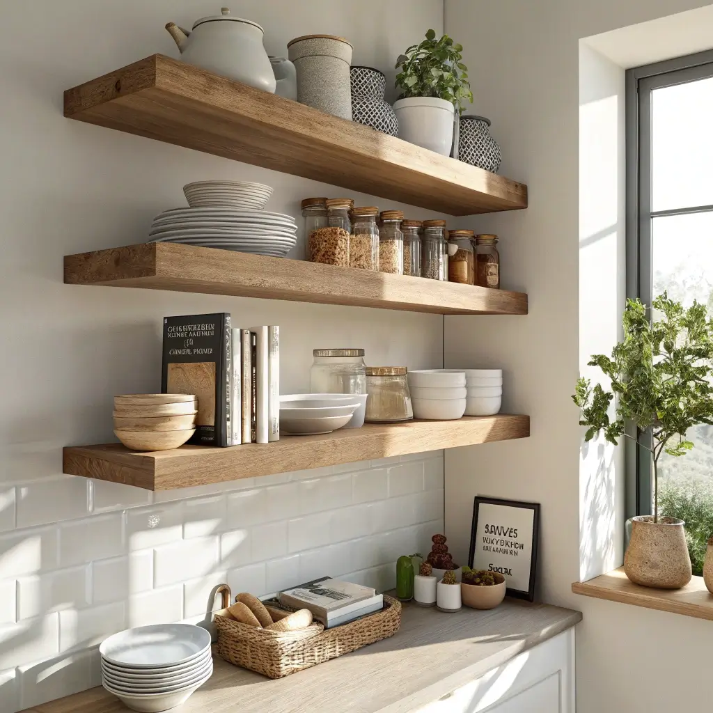 Choose shelves that match your cabinet hardware or go for a contrasting material that makes a statement. Wood shelves warm up a white kitchen, while glass shelves keep things light and airy. Just make sure they’re properly anchored—nobody wants their fancy olive oil collection crashing down mid-dinner party.