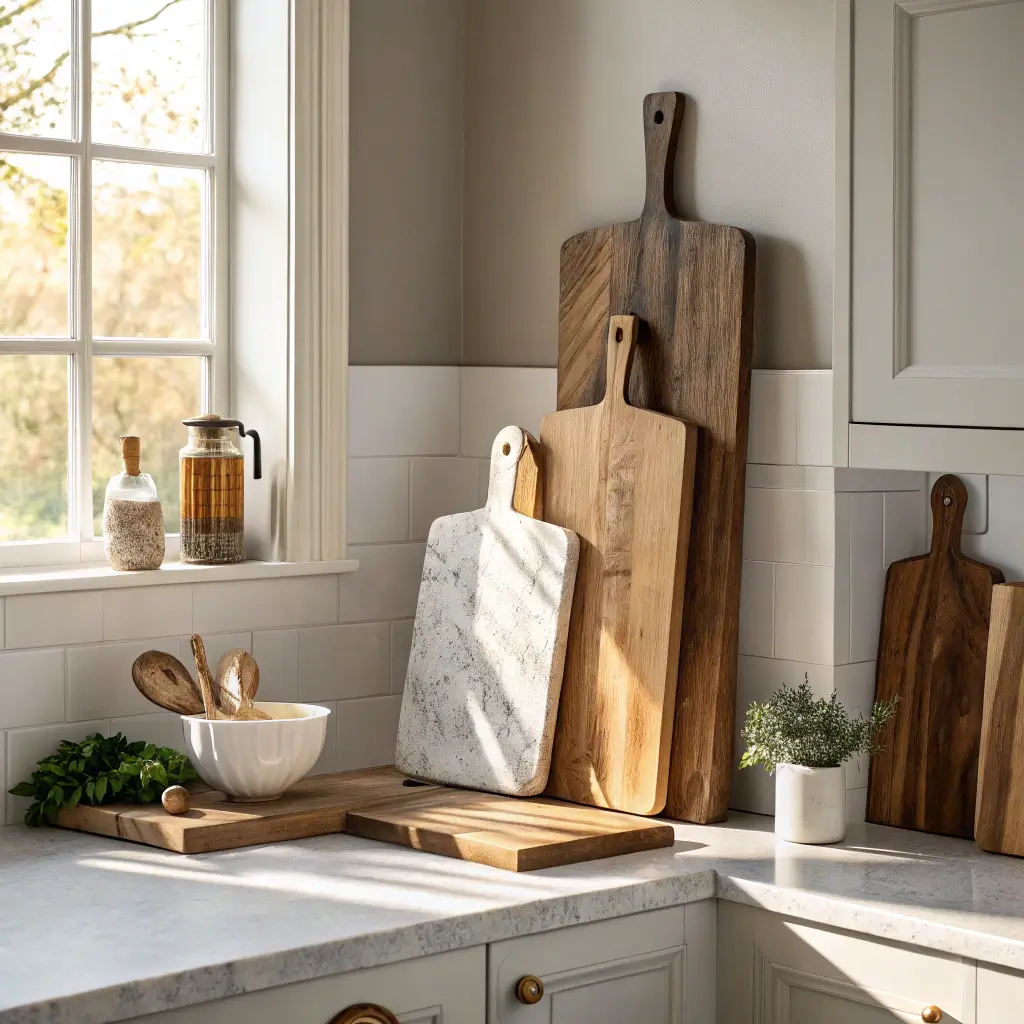 Mix different sizes and wood tones for visual interest. Include a marble board if you want to add elegance, or a colorful resin one for a modern pop. The key is choosing boards that are actually beautiful—those plastic ones from the dollar store aren’t doing anyone any favors in the decor department.