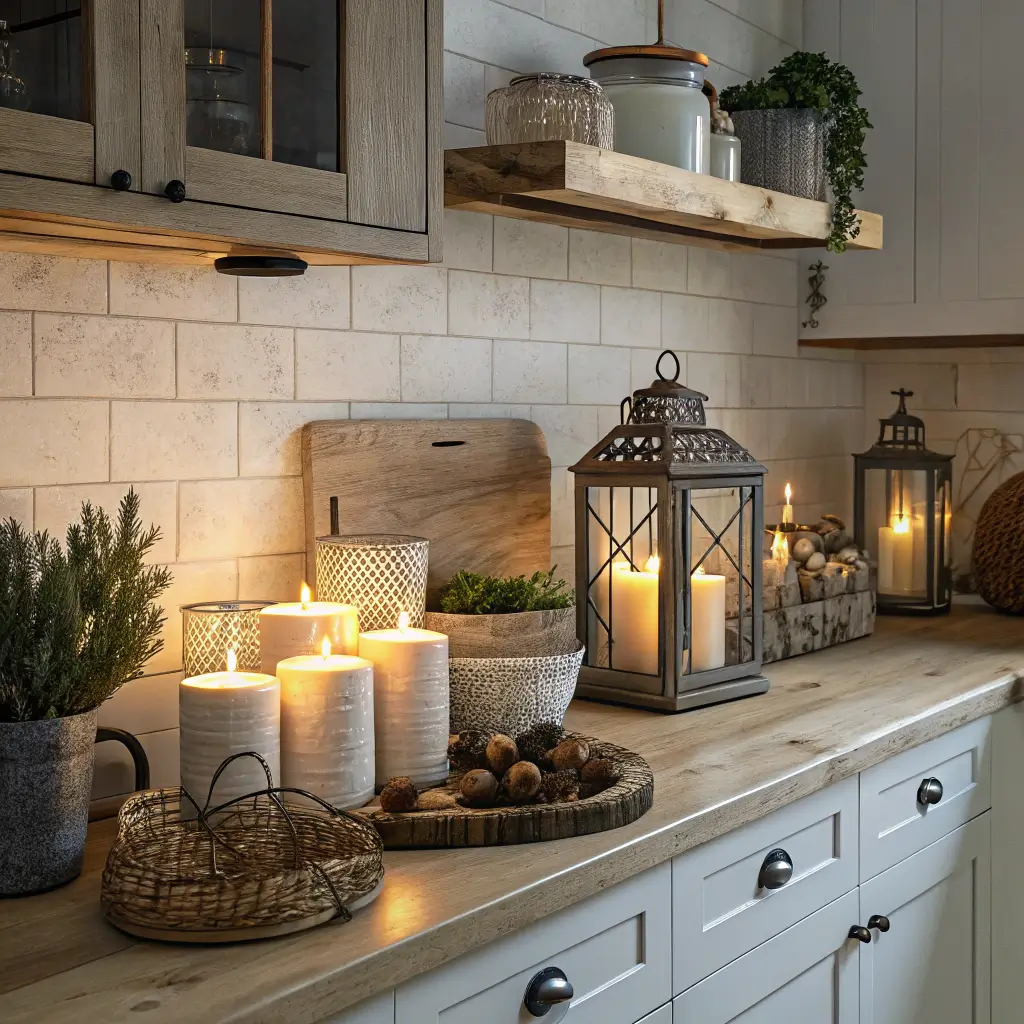 Creating ambiance in your kitchen goes beyond just good lighting. A corner dedicated to candles and lanterns adds warmth and personality, especially during evening meal prep. I started this after a power outage forced me to cook by candlelight, and honestly, everything tastes better in that glow.
