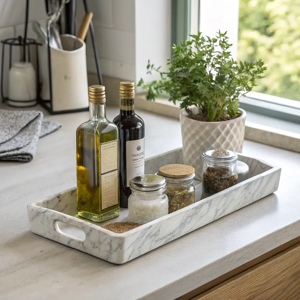 The marble acts as a unifying element, making even random items look intentional. Go for white marble for a classic look, or black marble if you want drama. Just seal it properly if you’re using real marble—learned that lesson after a lemon incident left a permanent mark on mine.