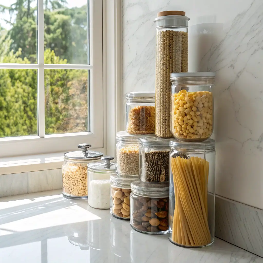 Choose jars with airtight lids to keep everything fresh. Label them clearly—either with pretty tags, vinyl letters, or a label maker if you’re going for that modern minimalist look. Arrange by height with tallest in back, and group similar items together. Your baking supplies in one cluster, pasta and grains in another.