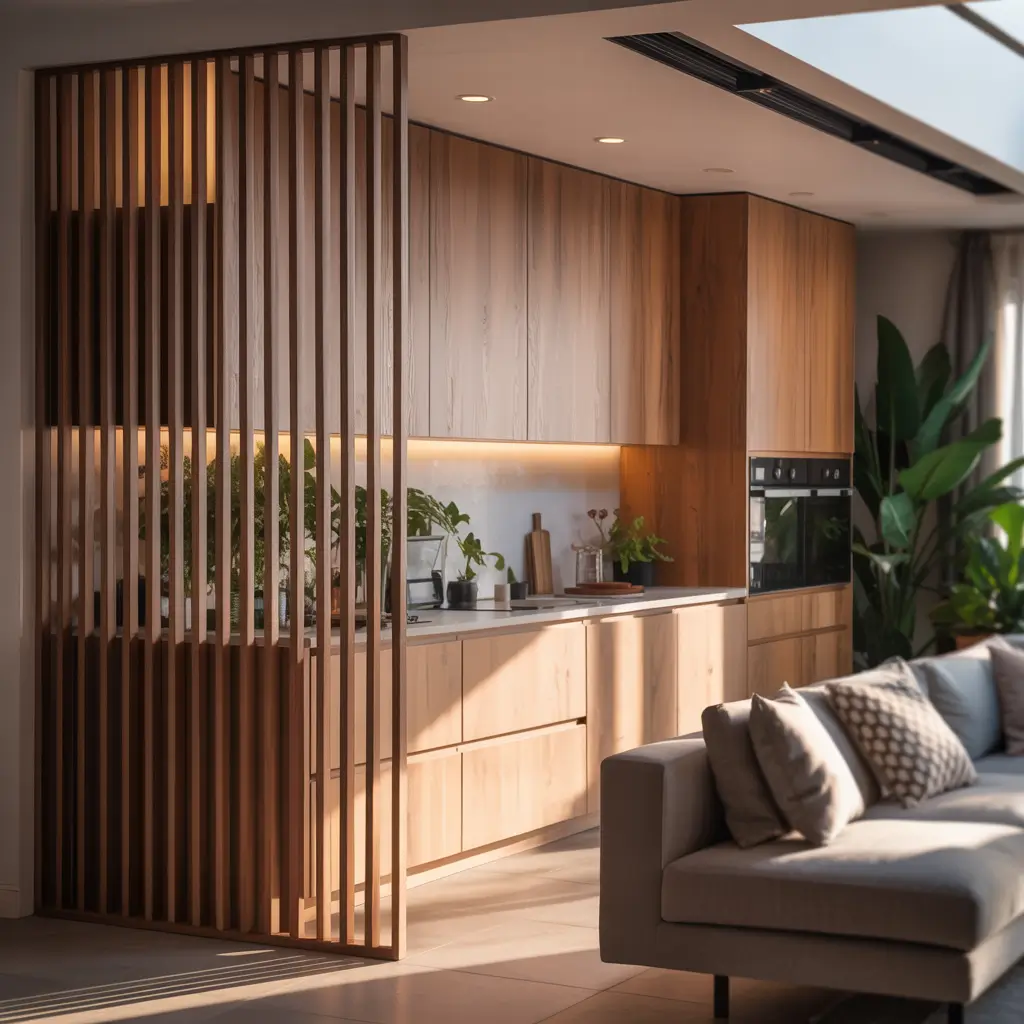 Wooden slats bring warmth to a kitchen like nothing else can. There’s something inherently cozy about wood that makes even the most modern kitchen feel welcoming. Slatted dividers offer the perfect balance between separation and connection – you get definition without feeling boxed in.