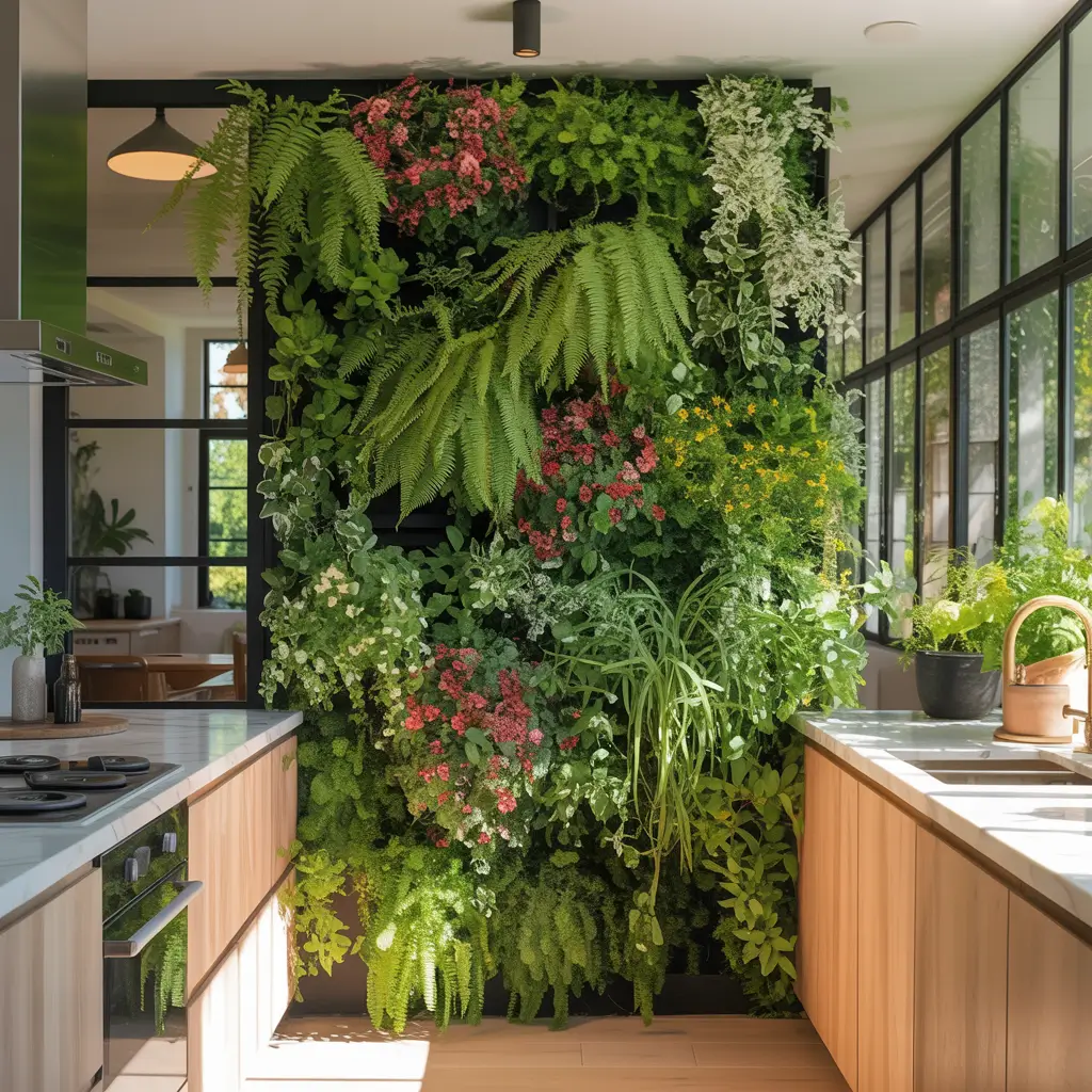Okay, this one’s my personal favorite because it combines function with serious Instagram potential. A vertical garden partition brings life into your kitchen while naturally purifying the air – and fresh herbs are literally at your fingertips when you’re cooking. It’s like having a farmers market in your kitchen, minus the early morning wake-up calls.