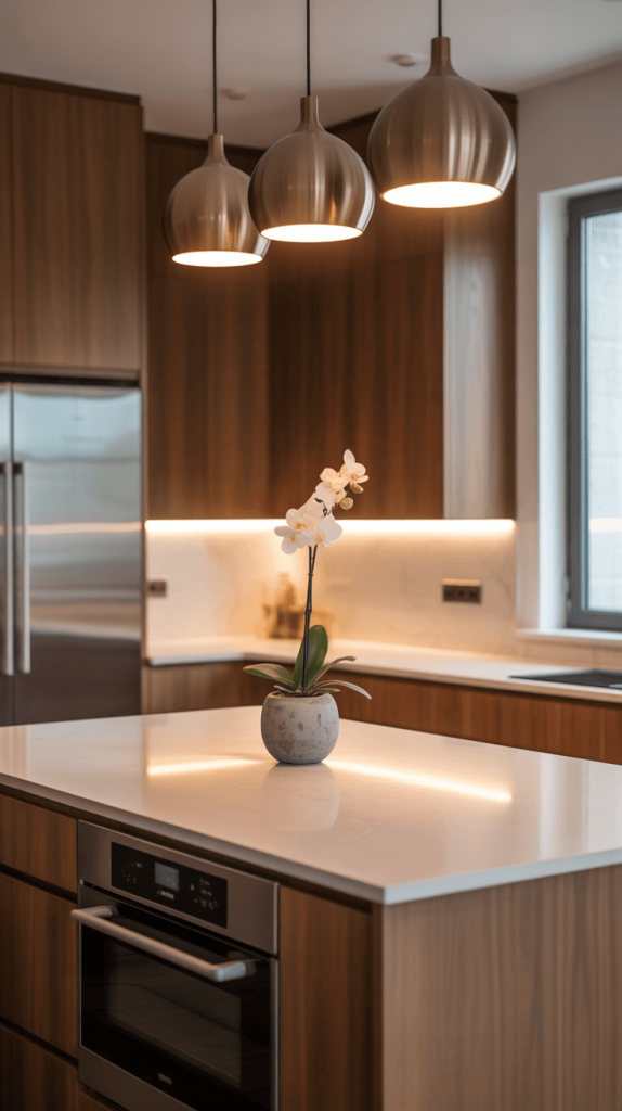 - Overhead: Replace that old ceiling fixture with a modern pendant or a stylish flush-mount light. If you have an island, a pair of pendants can instantly create a focal point.